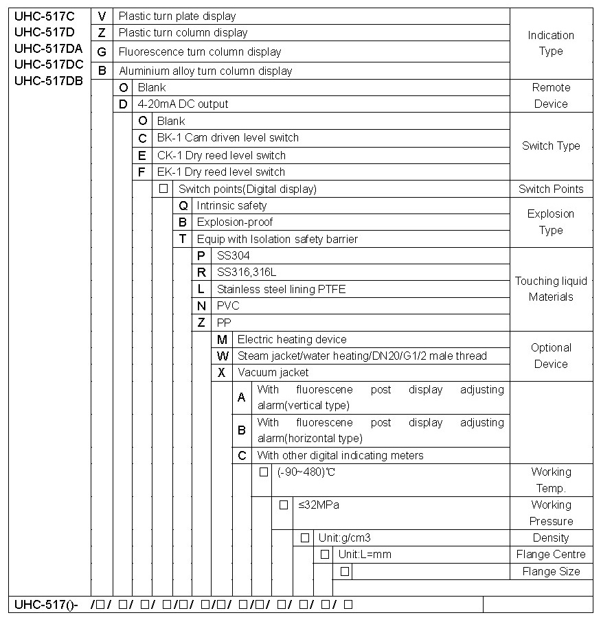 UHC-517 Series magnetical float level meters are suitable for measuring the liquid in open vessel or pressure vessel. With the features of tight sealing and leak proof, the meters can measure safely and reliability the liquid level in the severe conditions, such as: high temperature, high pressure, high viscosity, strong corrosion. The meters are featured also without blind zone, distinct indication, easy reading and wide measuring range.
