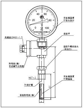 Bimetallic indication thermal resistance (thermocouple) is an integration temperature measurement instrument with on site indication and remote transmission display function.It can be used directly to measure the temperature of gasses、liquids and substances. The indication value can be read distinctly on site.And the signals can be transmitted to the control room.The transmitted signals include Pt 100,K type and E type thermal resistance signals,also the (4~20)mA standard signal after transmission. It plays a role as an instrument with two functions